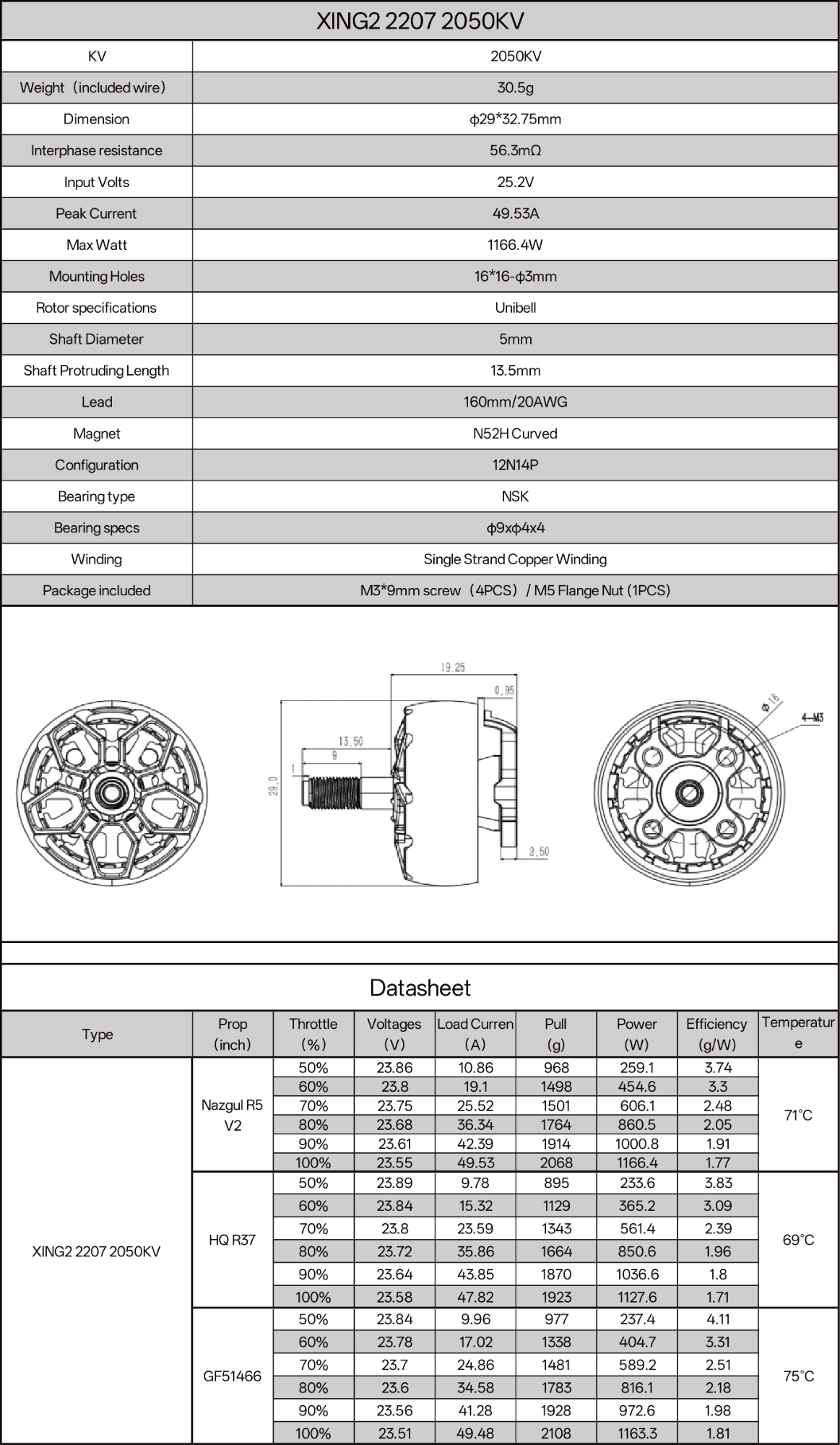 Input Volts: 25.2V (1750KV/2050KV) / 16.8V (2750KV)