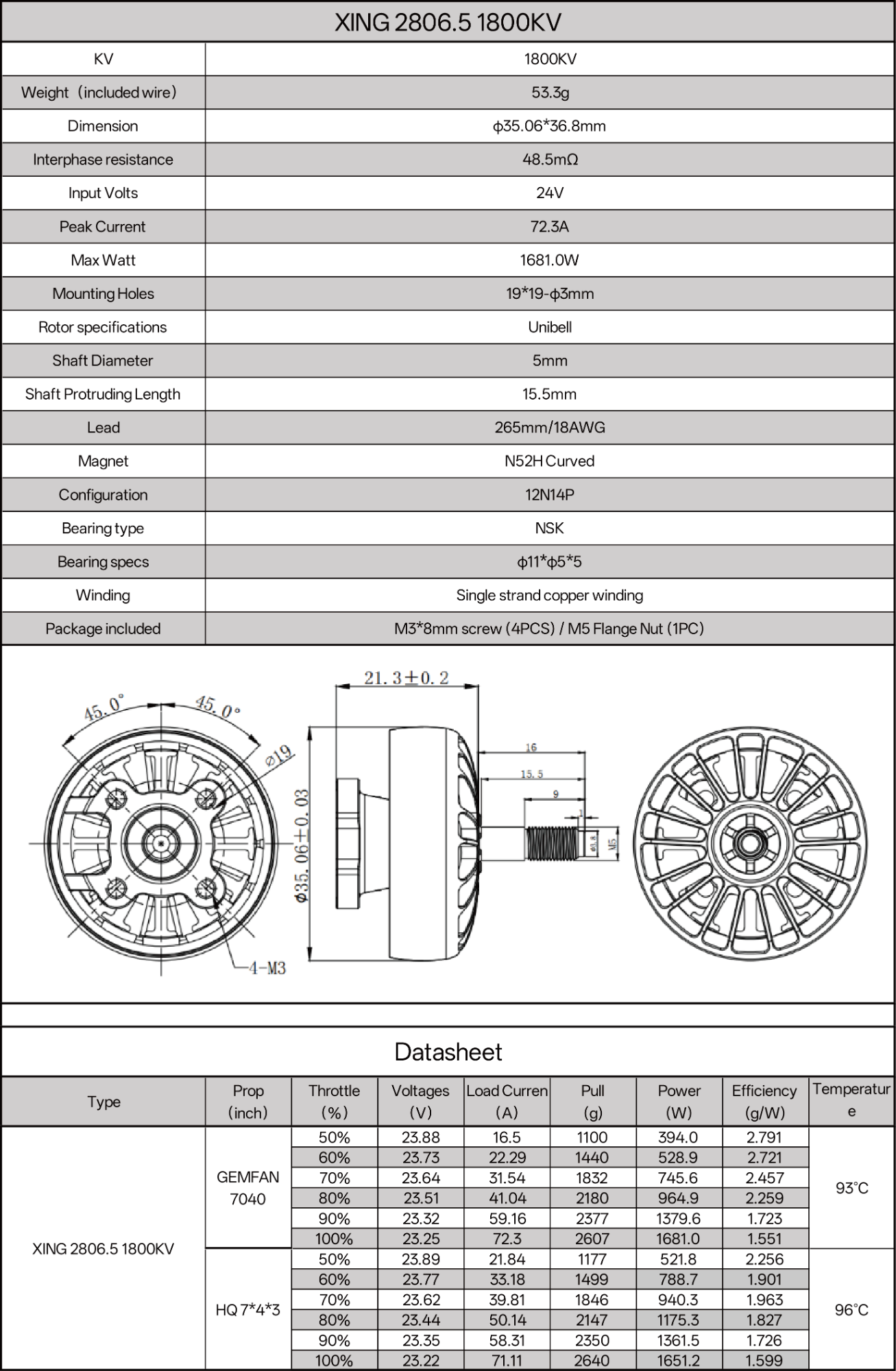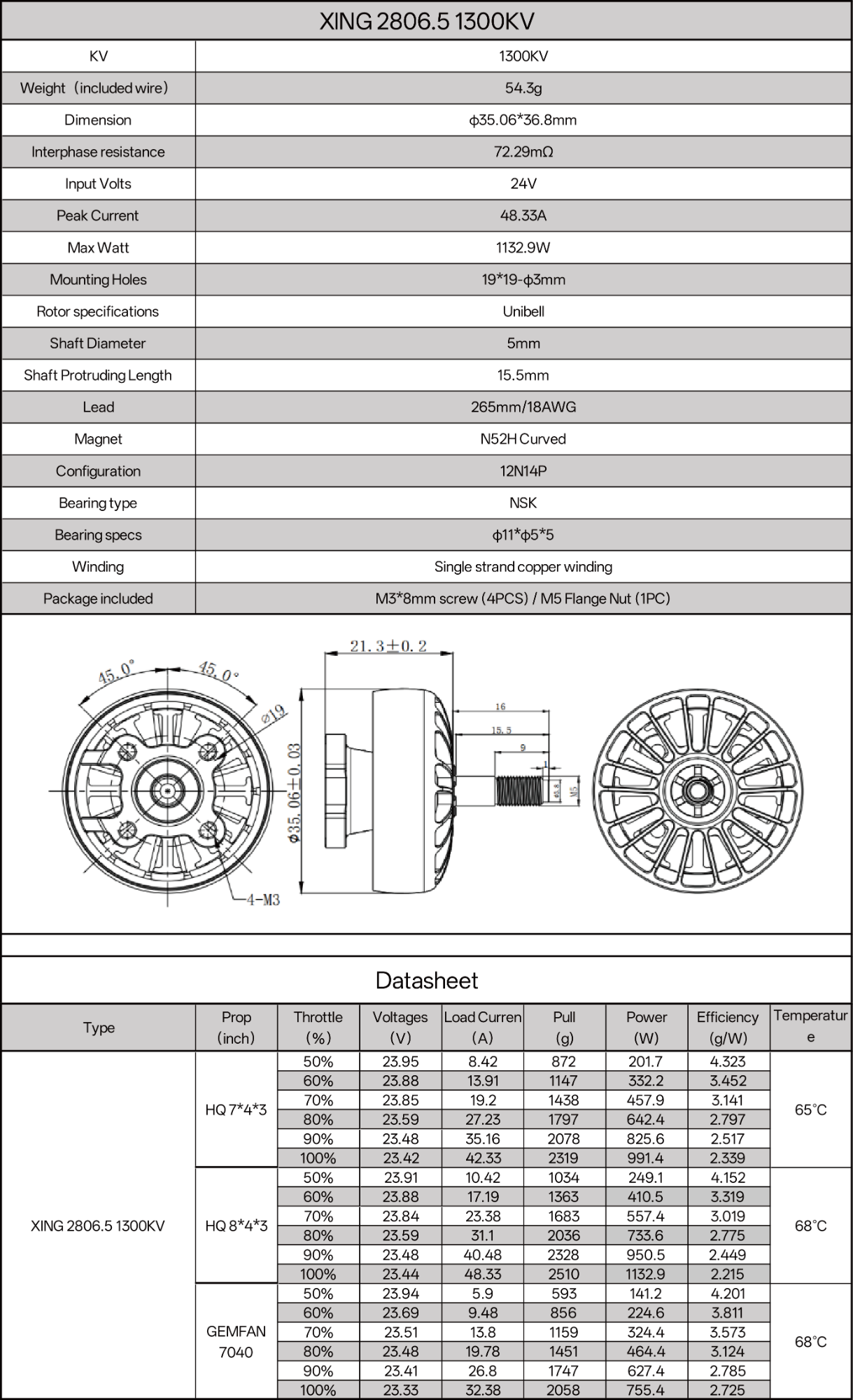 The Motor XING 2806.5 designed for bigger quads like 7-8 inch quad frames, which is with better efficiency in this range frames.The XING 2806.5 features uni-bell design and adopt Japan NSK bearing, N52H arc magnets. It offers incredible thrust number, highly responsive and extremely smooth flight characteristics. The bigger stator size 2806.5 allows it to provide instant power to save you from those crazy mountain dives last minute. It's a great motor if you're building bigger drones like 7 inch or 8 inch.