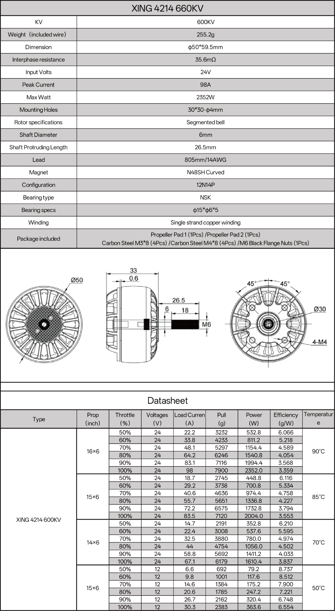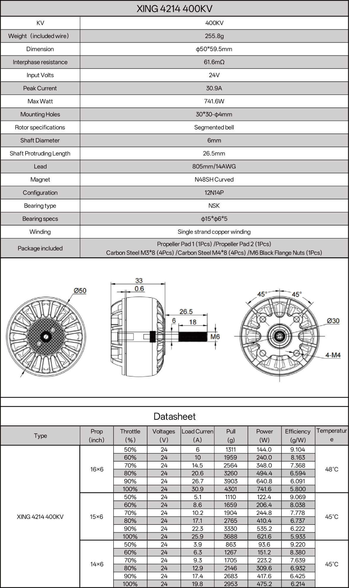 The iFlight XING 4214 motor is designed to provide responsive power with a low KV. It is perfect for 6S 15" X-Class racing drone like iX15! Named after and inspired by the XING series motor, matching its smooth and aggressive flying style, this motor comes with a solid stator & Pacific copper wires in combination with N45SH magnets & very small air gap. EZO bearings provide a silky smooth flight. All these results in unbelievable flight performance and experience!